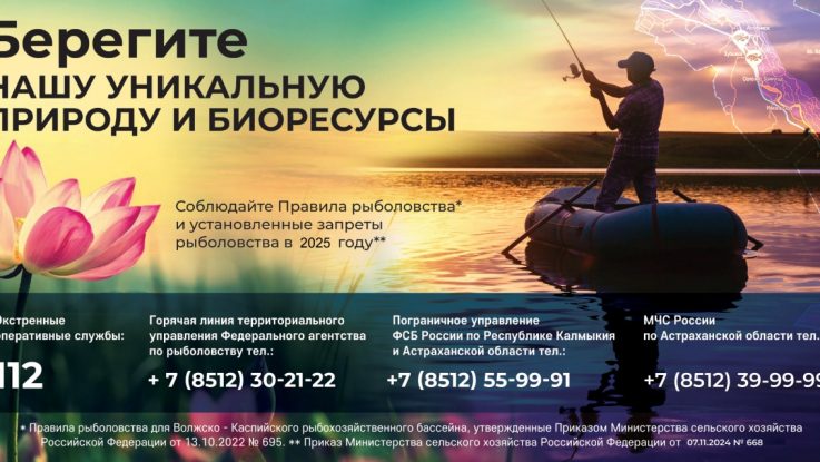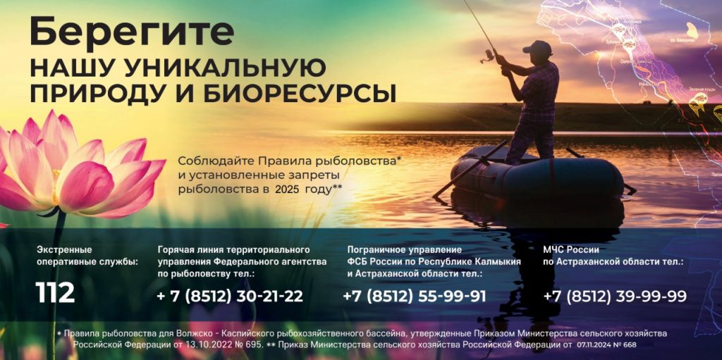 ВНИМАНИЕ! В соответствии с Приказом Минсельхоза России от 07.11.2024 № 668 «Об установлении ограничений промышленного и любительского рыболовства в отношении отдельных видов водных биологических ресурсов в водных объектах Волжско-Каспийского рыбохозяйственного бассейна в 2025 году» (зарегистрировано в Минюсте России 22.11.2024 № 80294, вступил в силу 01.01.2025 г.) в 2025 году: