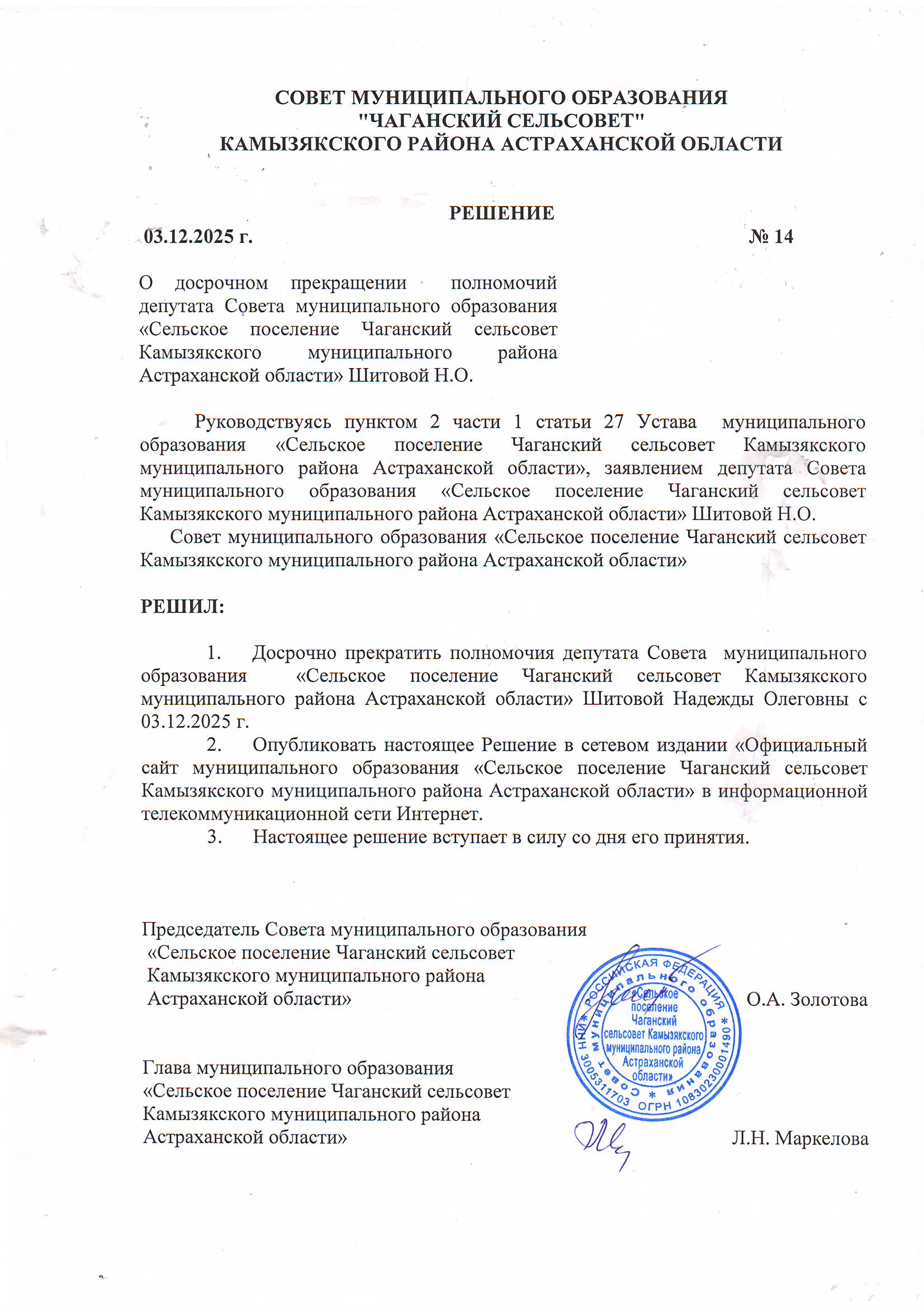 - РЕШЕНИЕ № 14 03.12.2025 г. О досрочном прекращении полномочий депутата Совета муниципального образования «Сельское поселение Чаганский сельсовет Камызякского муниципального района Астраханской области» Шитовой Н.О.